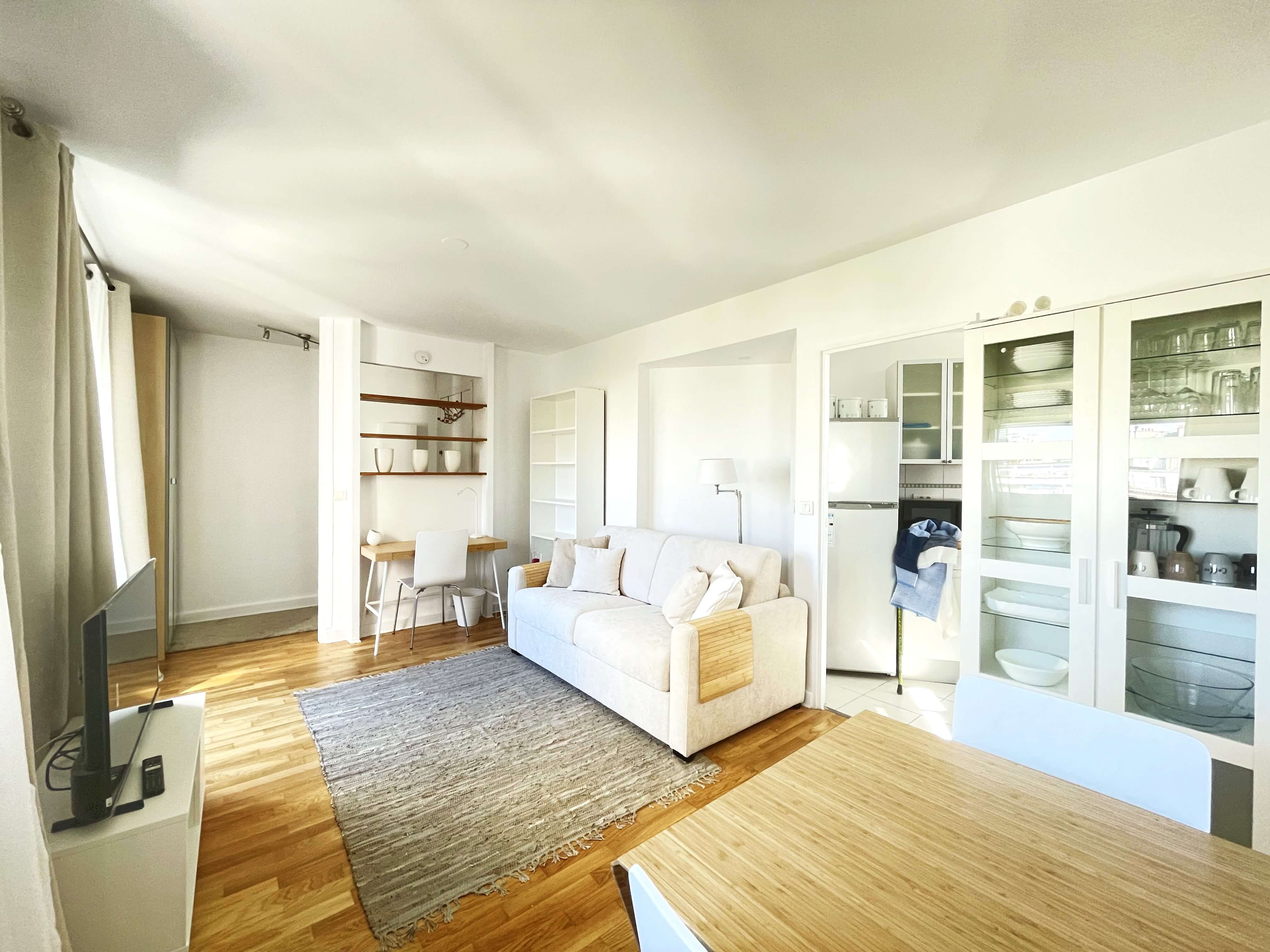 The apartment, quiet and bright, is located on the 6th floor with elevator in a securised building.