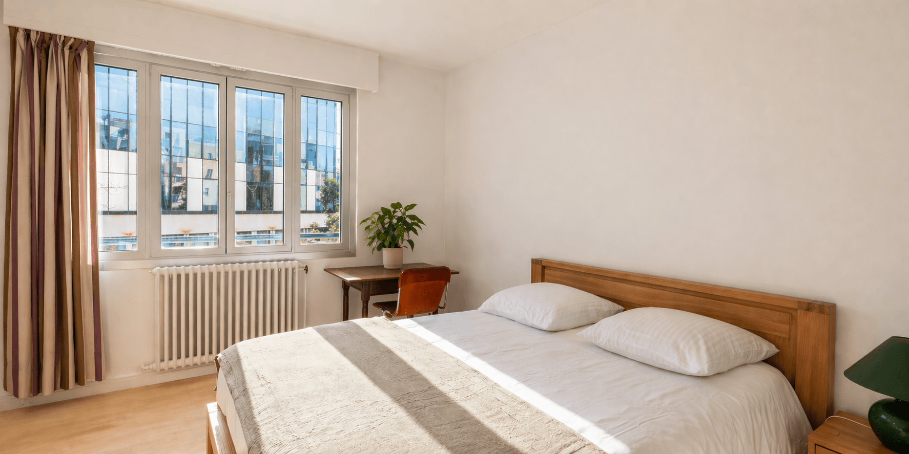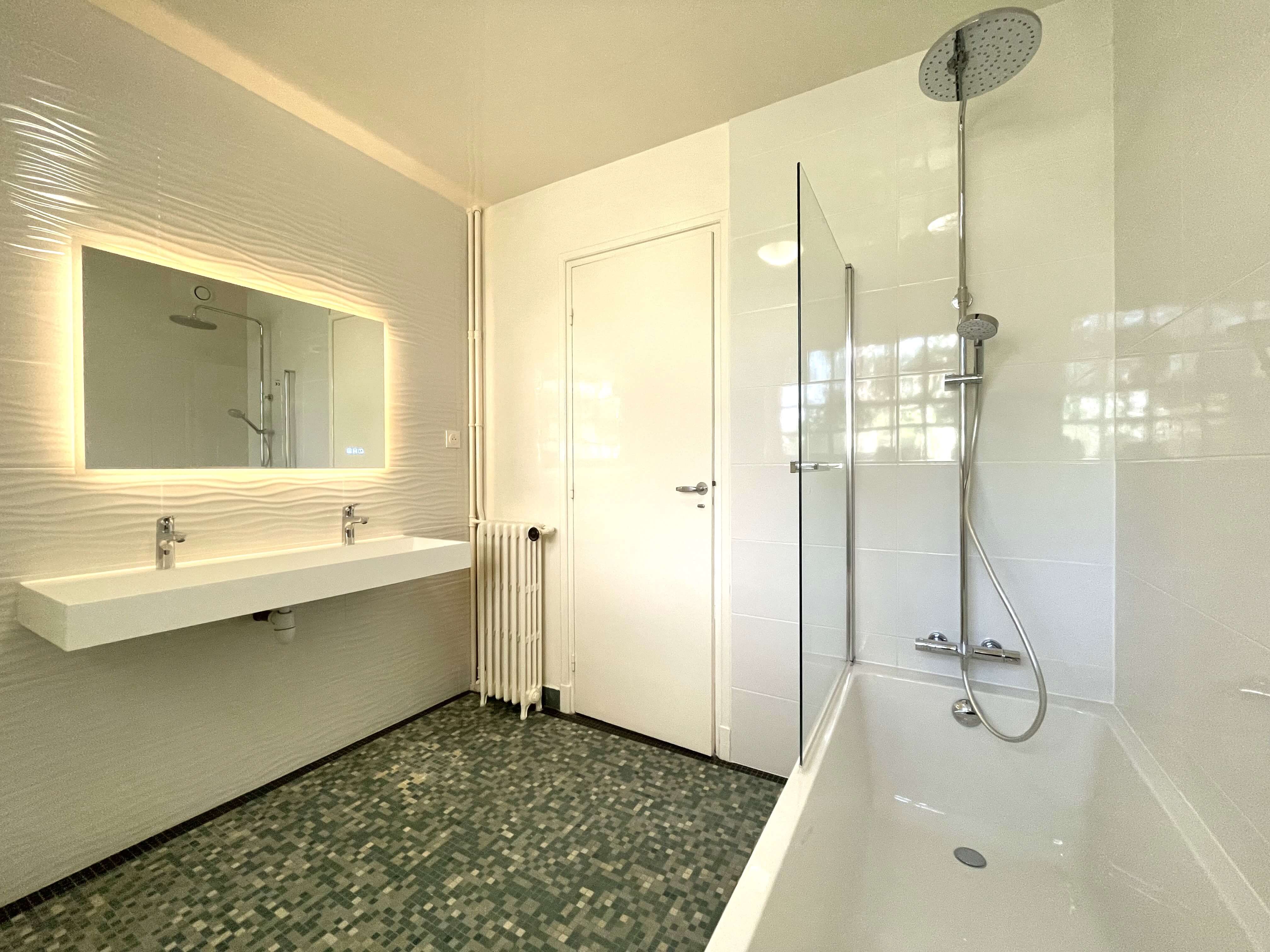L’espace nuit, distinct, se compose de deux chambres, également dotées de parquet, ainsi que d’une salle de bains et d’un cabinet de toilette, tous deux rénovés avec soin.