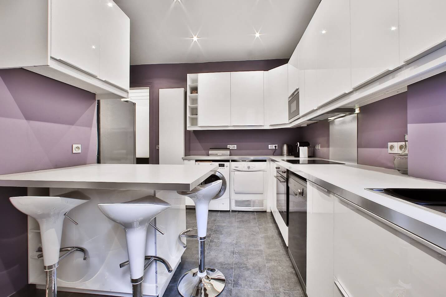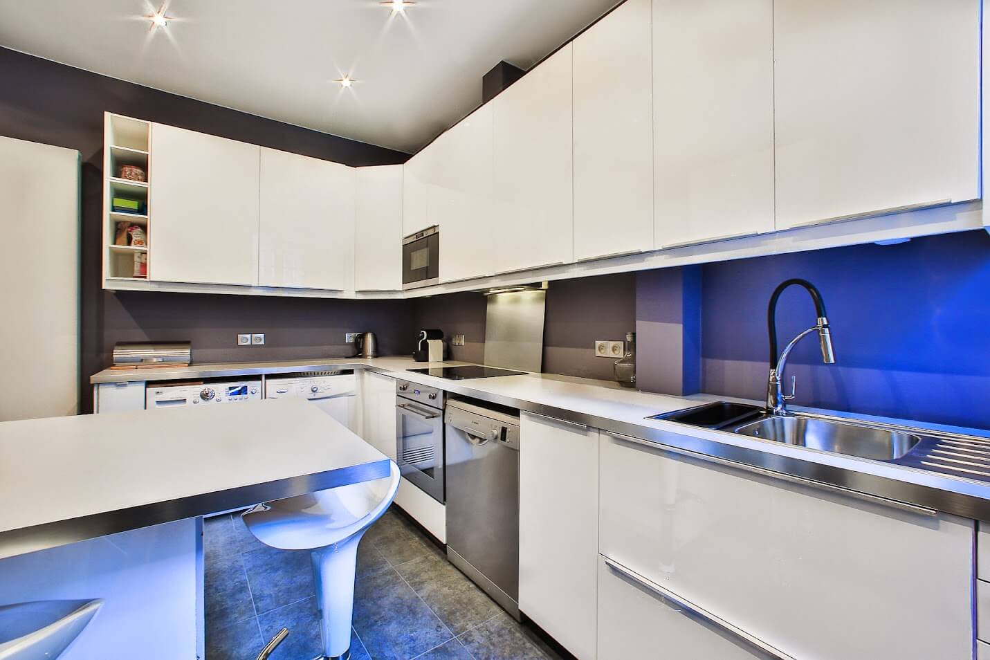 Situé au 5ème étage, il se compose d'une galerie d'entrée, d'un double séjour/ salle à manger avec balcon, d'une cuisine entièrement équipée notamment d'une cave à vin, d'un lave-linge et sèche-linge, de 3 chambres (3 lits 160x200), de nombreux placards, d'une salle de douches + WC, d'une salle de bains avec double vasque et WC séparé. Vaisselle et linge fournis. Equipements bébés et enfants sur demande et selon disponibilités. Meublé design, et décoré de quelques oeuvres d'art contemporain.