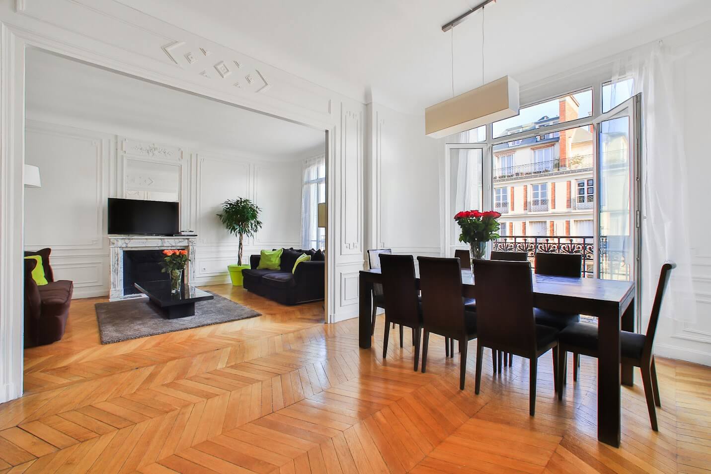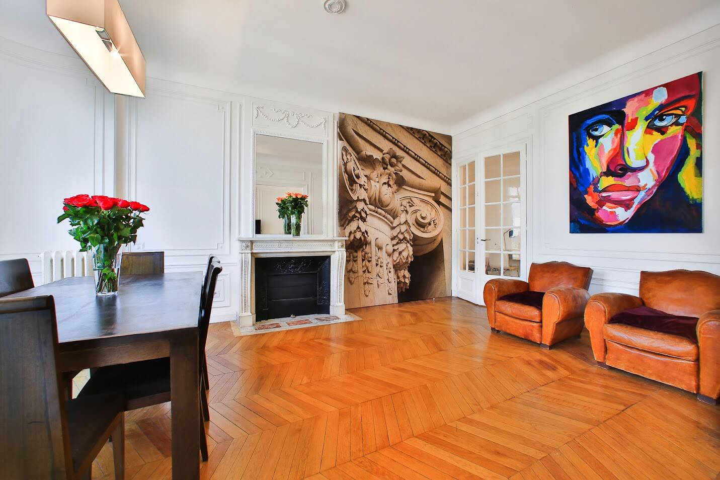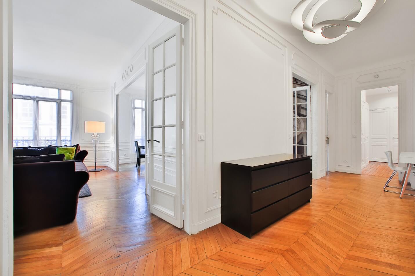 Appartement haussmannien avec parquet Point de Hongrie, moulures, cheminées, et belle hauteur sous plafond.