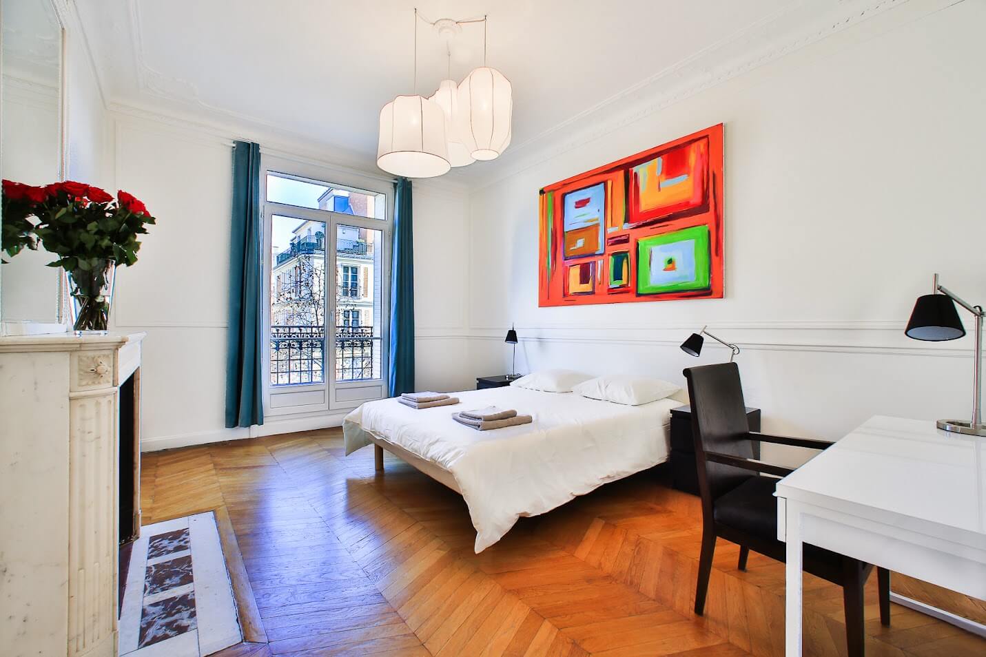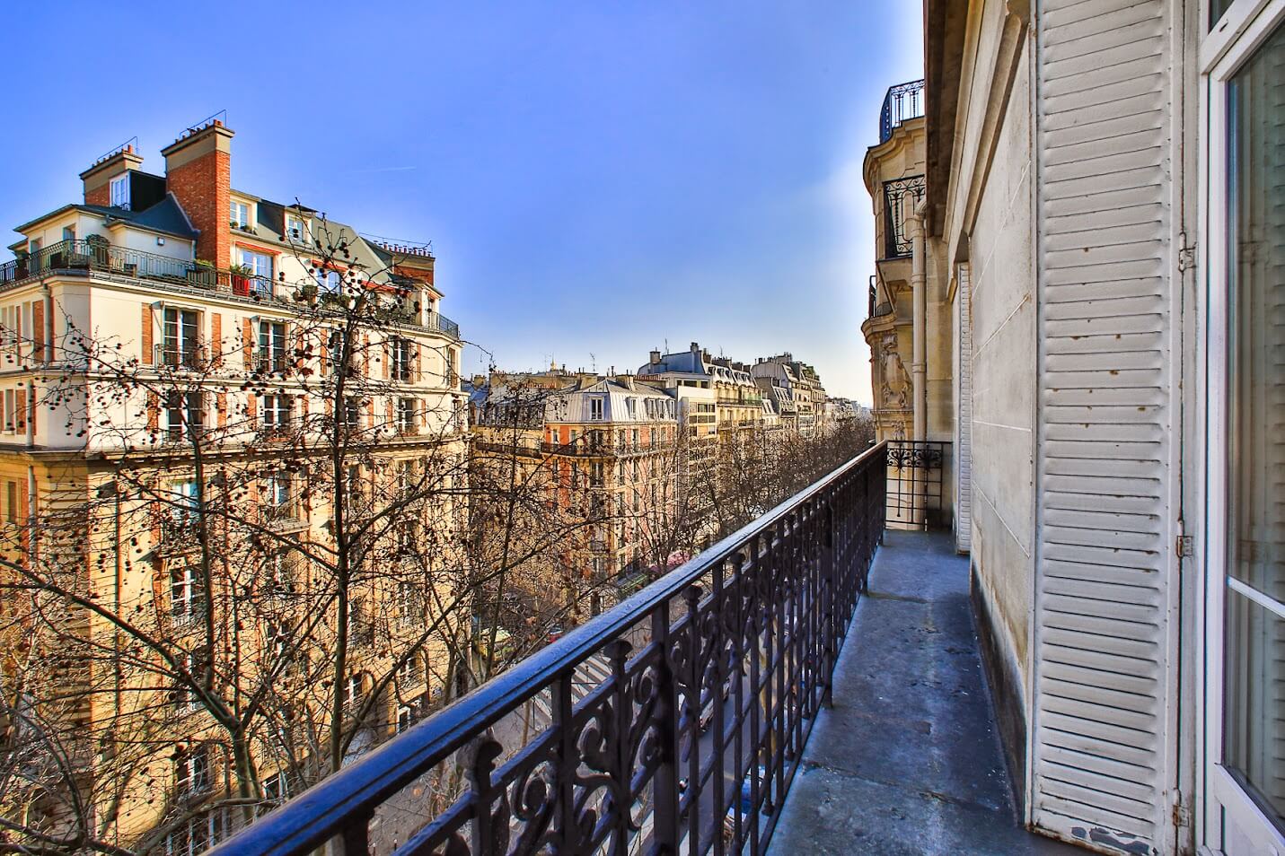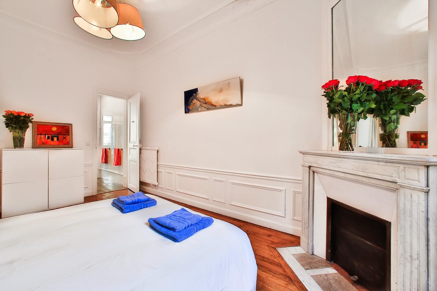 Appartement haussmannien avec parquet Point de Hongrie, moulures, cheminées, et belle hauteur sous plafond.