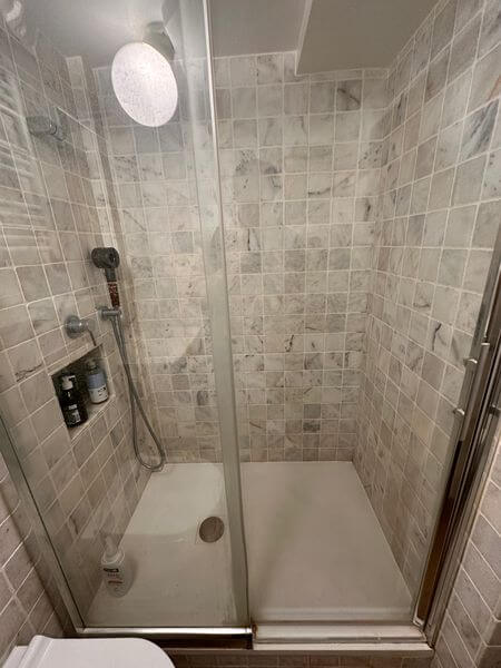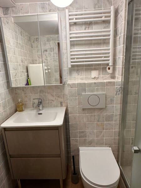 La salle d’eau moderne, entièrement carrelée, comprend une douche avec paroi vitrée, un meuble vasque avec miroir, des WC ainsi qu’un sèche-serviettes.