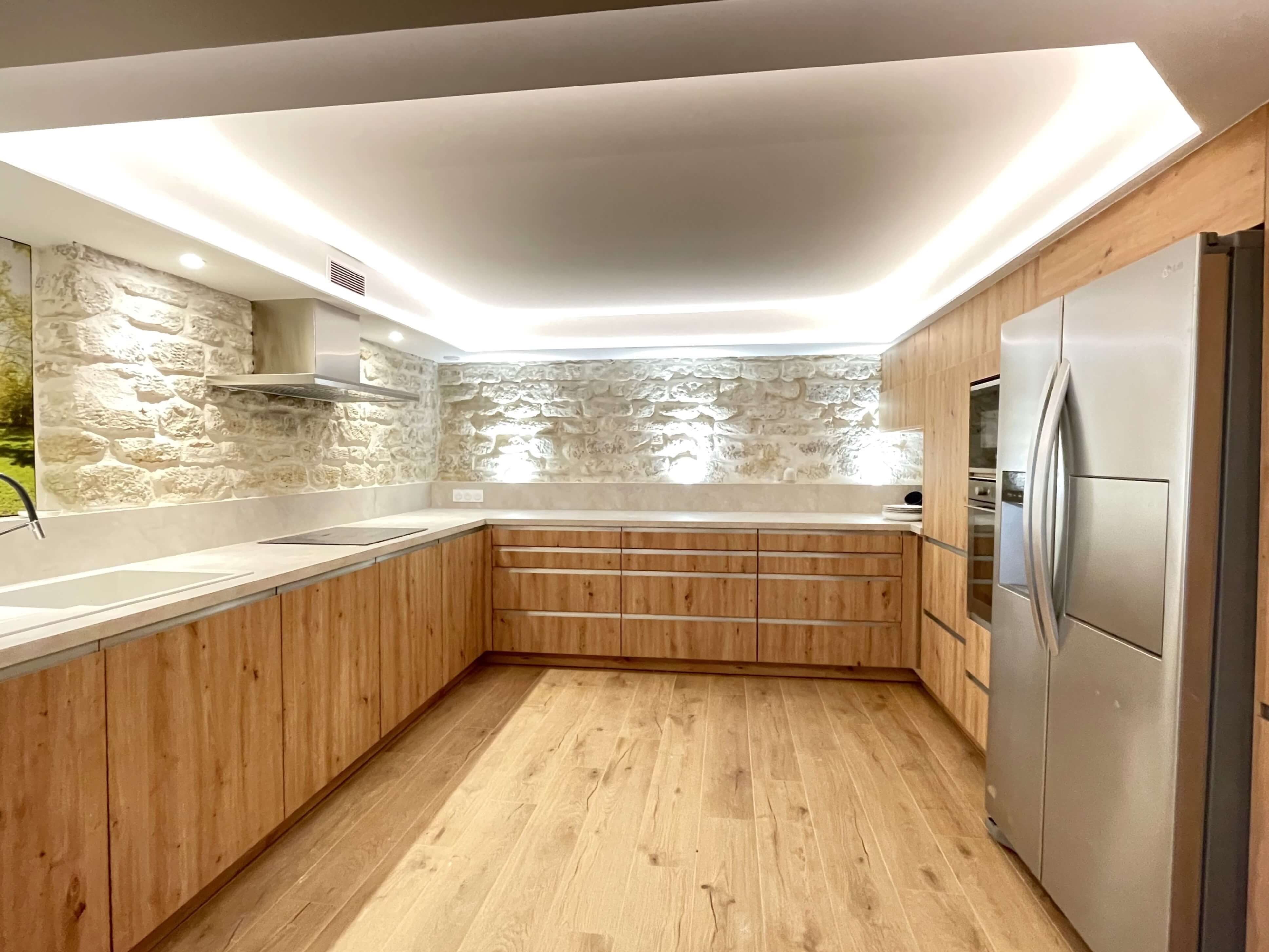 La maison est composée de trois niveaux : au RDC, un très bel espace « esprit loft » se compose d’un triple séjour de 43 m²avec un canapé-convertible donnant sur un patio intérieur avec un Home Cinéma doté de 5 enceintes, d’une grande cuisine semi-ouverte avec pierres apparentes et électroménager de qualité (lave-vaisselle neuf, plaques induction neuves, hotte neuve, four, réfrégérateur américain, mico-ondes), ainsi qu’une chambre et une salle d’eau, un WC et une buanderie (lave-linge et sèche-linge). Plancher en carrelage chauffant en 6 zones.